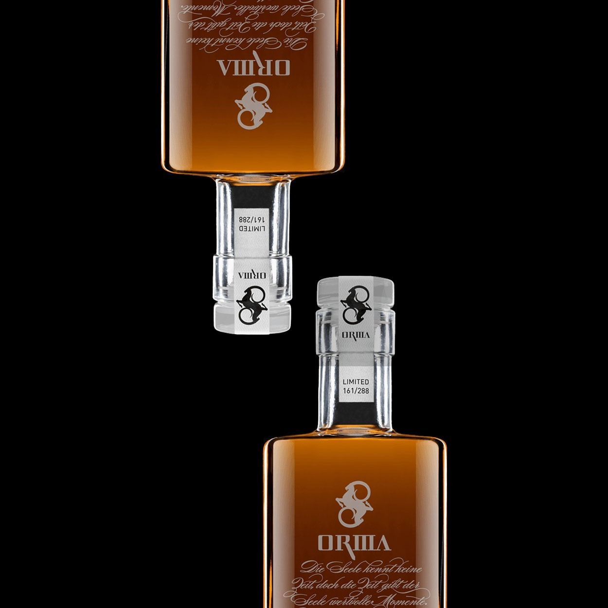 Als Hommage an die Zeit und der urschweizerischen Kunst der Uhrenmanufaktur enthält der Schriftzug Elemente einer Uhr. Der Buchstabe R beinhaltet den Uhrzeiger. Wird die ORMA Whisky Flasche um 180° gedreht, so erkennt man die römische Zahl 8. Es ist dieselbe Zahl, die wiederum im Symbol der Steinböcke zu finden ist. Sie ist die Glückszahl, die auch für Harmonie, Verbundenheit und Vollkommenheit steht.